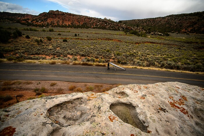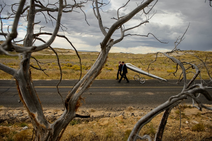 (Trent Nelson | The Salt Lake Tribune) German artists Thomas Huber (pictured) and Wolfgang Aichner on the first day of their art project, Linear, about ten miles northwest of Vernal Wednesday September 13, 2017. The duo are launching a four-week long performance art project in which they are filming themselves dragging an oversized giant silver pen through a 250-mile rectangular through the deserts of Utah, Wyoming and Colorado.