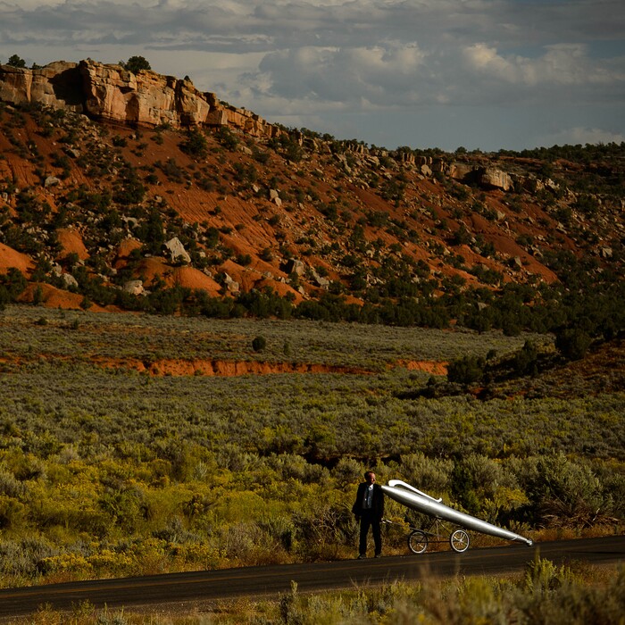 The oversized pen, more than 4 meters high, is made of foam board, which was then sprayed with silver metallic paint. The pen features a small wheel at the point, which will leave a temporary imprint on the dusty ground while also providing visual scale. From a distance, a viewer might perceive the pen as regular-sized, while the man in the suit would appear teeny as a beetle, Aichner said in a phone interview.