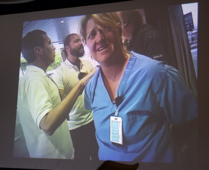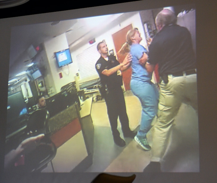 (Salt Lake City Police Department/Courtesy of Karra Porter) In this July 26, 2017, frame grab from video taken from a police body camera and provided by attorney Karra Porter, nurse Alex Wubbels is arrested by a Salt Lake City police officer at University Hospital in Salt Lake City. The Utah police department is making changes after the officer dragged Wubbels out of the hospital in handcuffs when she refused to allow blood to be drawn from an unconscious patient.