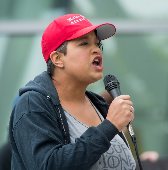 (Francisco Kjolseth | The Salt Lake Tribune) Ian De Oliveira, with Utah Against Police Brutality, joins others to to demand justice for the killing of Patrick Harmon who was shot by police on Aug. 13, when he tried to flee after being stopped on his bicycle. Around 150 people gathered for the rally at the Salt Lake City Public Safety Building on Sunday, Oct. 8, 2017, demanding Salt Lake County district attorney Sim Gill be fired for his "justified," ruling in the case.