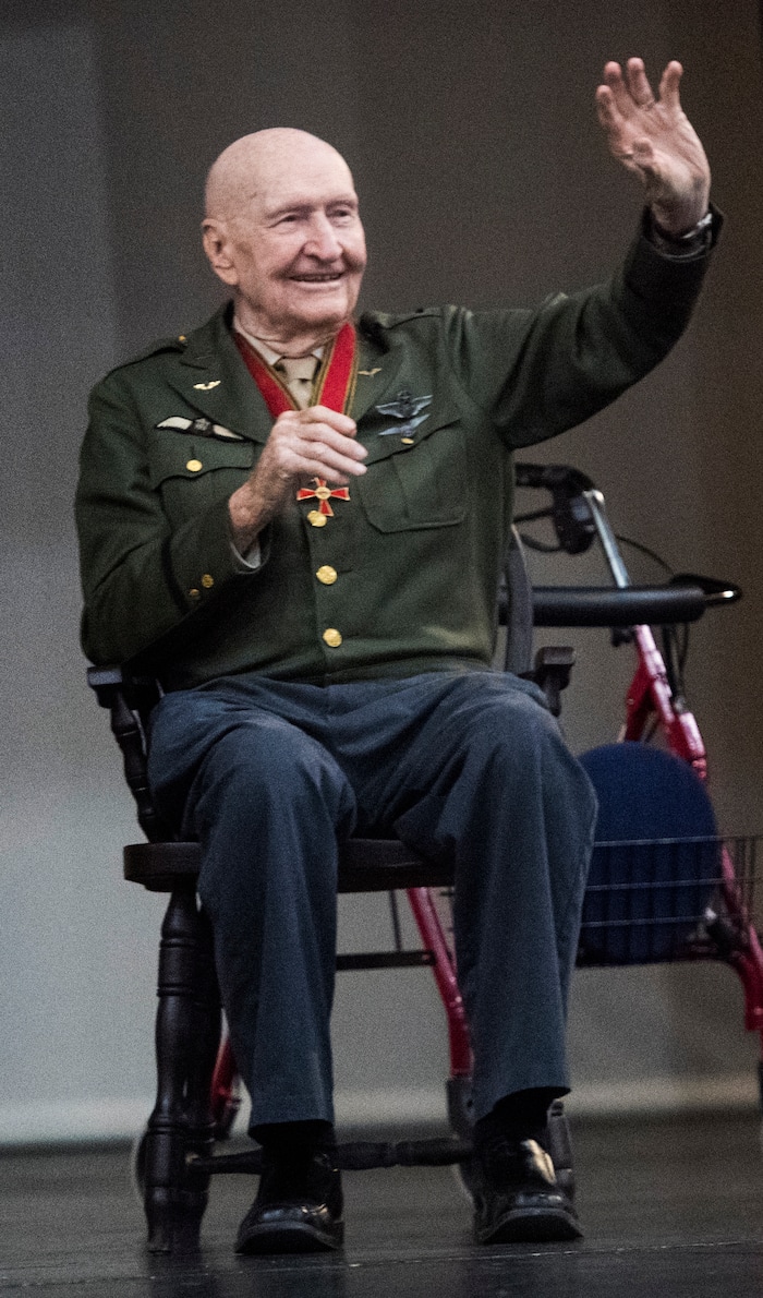 (Rick Egan | The Salt Lake Tribune) Gail Halvorsen waves to the cast of the Mueller Park Jr High production of "The Berlin Candy Bomber" after speaking to them between performances, at Woods Cross High School, Saturday, November 11, 2017.