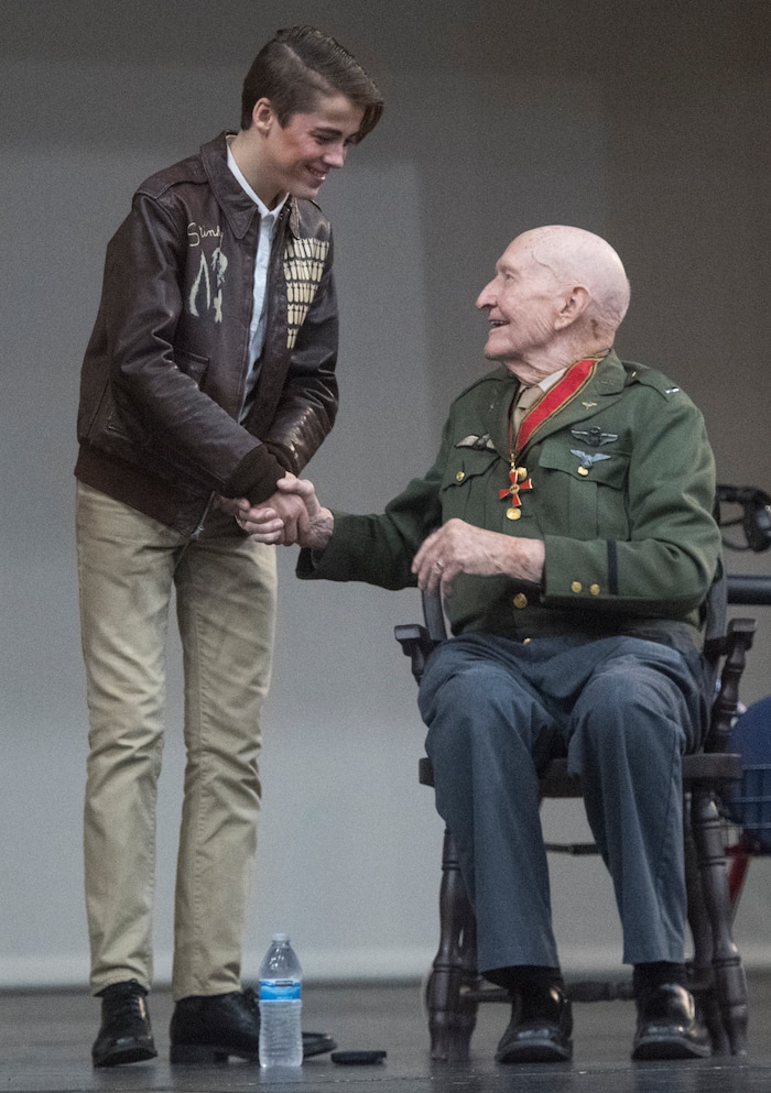 (Rick Egan | The Salt Lake Tribune) Gabe Duggar meets Gail Halvorsen, after playing the part of Gail Halvorsen in the Mueller Park Jr High production of "The Berlin Candy Bomber" at Woods Cross High School, Saturday, November 11, 2017.