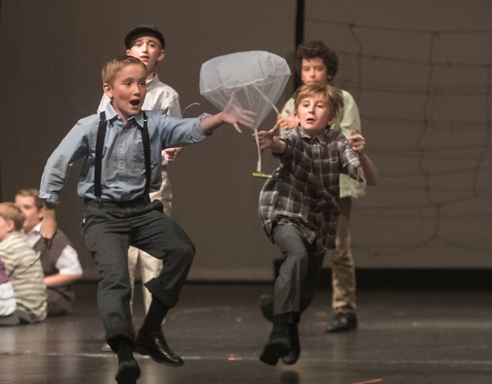 (Rick Egan | The Salt Lake Tribune) Mueller Park Jr High students playing children from West Berlin, chase handkerchiefs with candy bars attached in the Mueller Park Jr High production of "The Berlin Candy Bomber" at Woods Cross High School, Saturday, November 11, 2017.