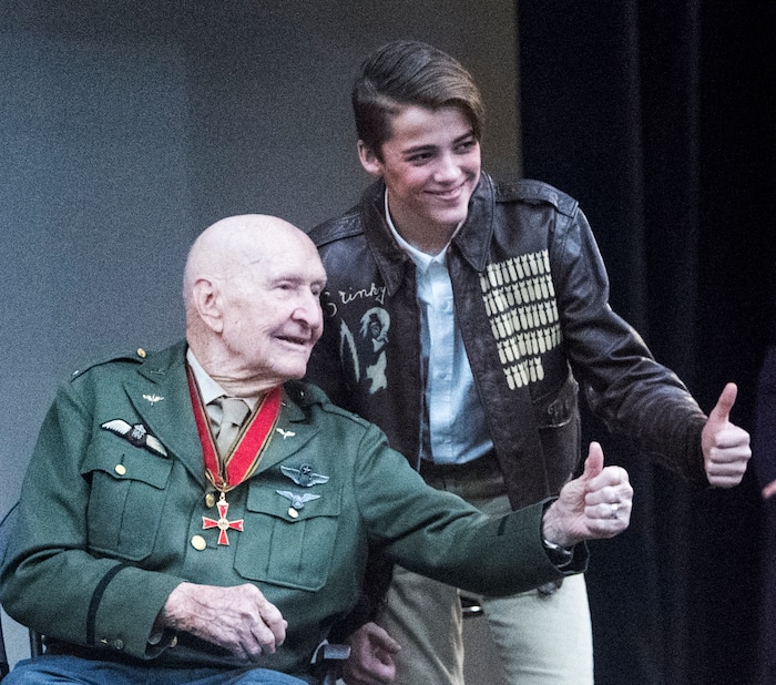 (Rick Egan | The Salt Lake Tribune) Gabe Duggar poses for a photo with Candy Bomber, Gail Halvorsen, after playing the part of Gail Halvorsen in the Mueller Park Jr High production of "The Berlin Candy Bomber" at Woods Cross High School, Saturday, November 11, 2017.