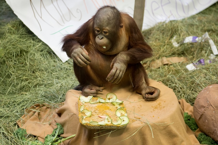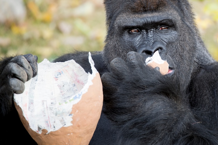 But Thanksgiving at Hogle Zoo wasn’t all about pumpkins. Workers gave animals other treats, as well as papier-mache turkeys and turkey legs sprayed with perfumes. The big cats “are really excited about scented items,” said Hogle staffer Beth Wegner. “And we want them to enjoy them even more.”