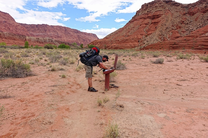 (Tribune File Photo) Peter Wagner signs a log book after hiking nearly 50 miles through Paria Canyon. Wednesday, Sept. 28, 2016.