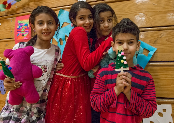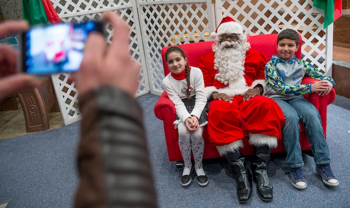 Two small Iraqi boys in matching red and green elf hats sat on a giant red armchair on either side of Santa Claus on Friday evening. The younger of the two, a 7-month-old, stared up at Santa. His 19-month-old brother sat on the edge of the chair and looked ahead at his parents, who were snapping photos.