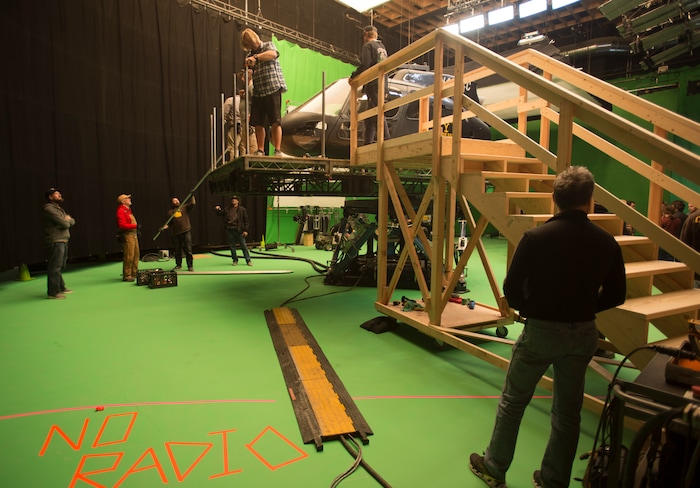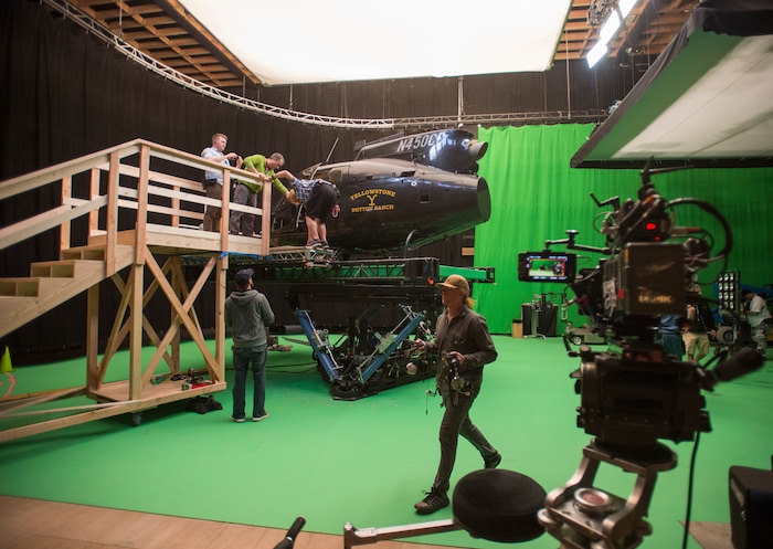 (Rick Egan | The Salt Lake Tribune) Stage crews prepare to shoot a helicopter scene for the upcoming Paramount Network series "Yellowstone" on a soundstage at Utah Film Studios in Park City. The series stars Oscar-winner Kevin Costner, who is also an executive producer, as the patriarch of a family that owns the largest contiguous ranch in the United States, which borders on Yellowstone National Park.