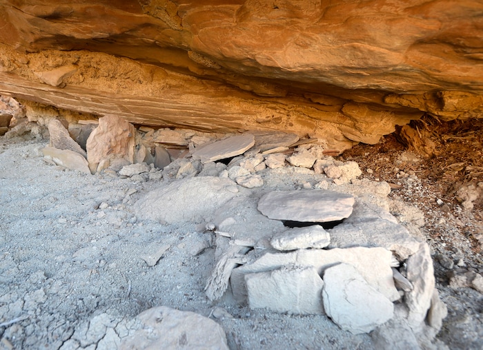 The area may be rich in rock art and “lithic scatters” of stone artifacts, pot and arrow fragments, but it lacks evidence of permanent habitations other than small granaries tucked under overhanging rocks. The pattern suggests the area was used seasonally.