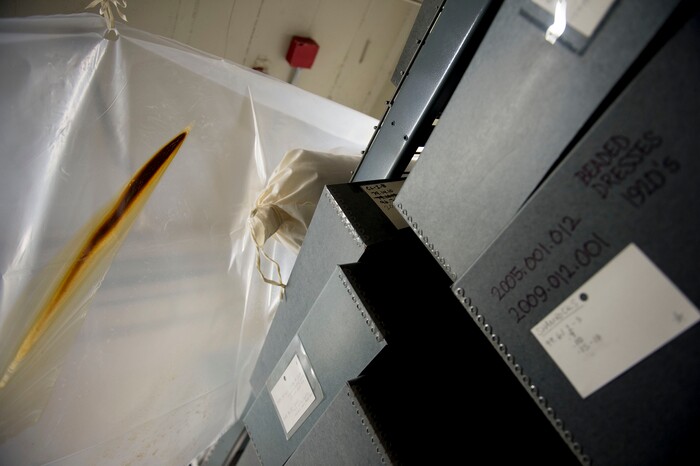 In the textile room, a digital thermometer tracks temperatures and humidity but can’t adjust either. A channel was built along the back wall to collect water that leaked through the foundation one spring. A few feet away, a box made of archival-grade cardboard holds a Civil War uniform. Water can be heard rushing through pipes overhead whenever someone flushes a toilet near the Rio Grande Cafe overhead.