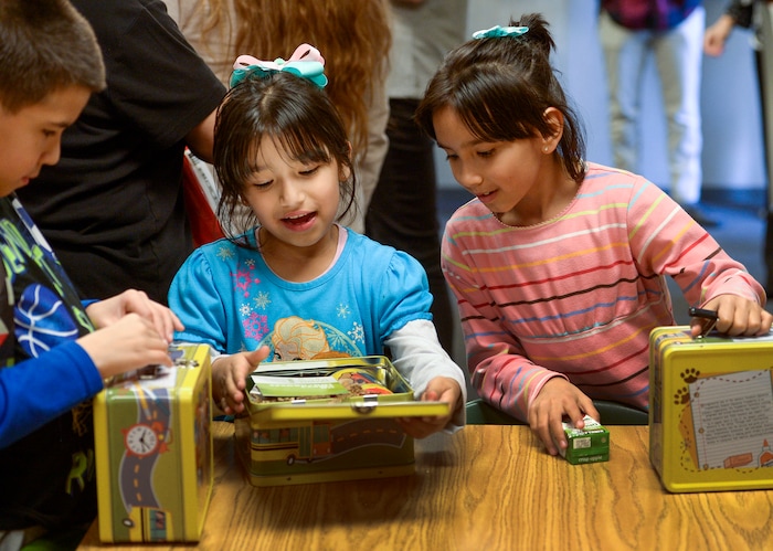 (Leah Hogsten | The Salt Lake Tribune) l-r Siblings Jonathan Escobar, Elizabeth Escobar and Diana Escobar like their new lunch boxes and what's inside them, Tuesday, March 13, 2018 during a food pantry dedication at their school. Smiths Food & Drug is helping to open a food pantry at David Gourley Elementary School in Kearns, where 80 percent of the 646 students qualify for free or reduced lunches.