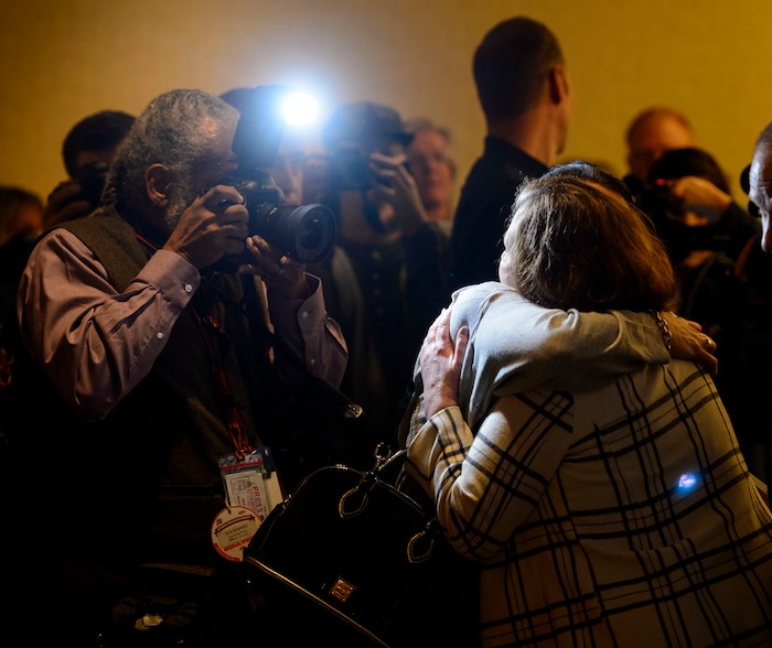 Amid news reporters, supporters of Denson applauded and offered the woman hugs after Thursday’s news conference.