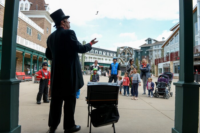 (Leah Hogsten | The Salt Lake Tribune) From left, Magic Century the magician keeps Alex Vonderwense, 6, his brother Finn Vonderwense, 8, and Vincent Edge, 9, guessing and giggling during magic tricks on the Legacy Plaza at Park City Mountain Resort, Thursday, April 5, 2018.