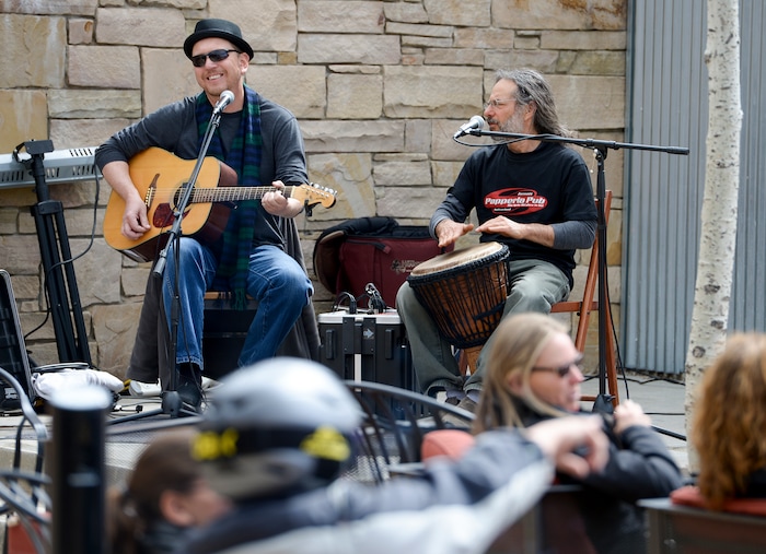 (Leah Hogsten | The Salt Lake Tribune) The band Lash LaRue plays outside The Corner Store at Park City Mountain Resort, Thursday, April 5, 2018.