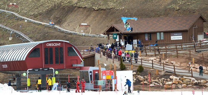 (Leah Hogsten | The Salt Lake Tribune) As skiers hop on the Crescent lift, a line of thrill seekers forms at the entrance to the Flying Eagle Zip Line and the Alpine Coaster at Park City Mountain Resort, Thursday, April 5, 2018. Despite the late arriving and limited snow this year, Utah ski resorts say they fared well because of snowmaking and the provision of side activities that helped ensure destination visitors had a good time while they were here, snow or no snow.