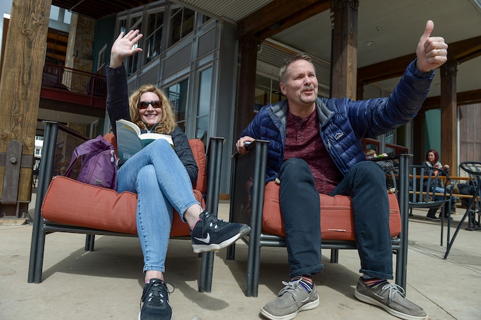 (Leah Hogsten | The Salt Lake Tribune) Kari Woolf, left, and Karl Ford of Orem wave at their two sons, Jayden and Elijah, who take off on Payday lift to make another snowboard run during their spring break at Park City Mountain Resort, Thursday, April 5, 2018. The family is staying at the resort so the boys can perfect their snowboarding skills and mom and dad can rest and relax off the slopes.