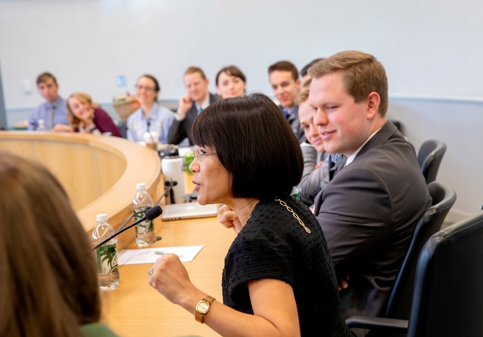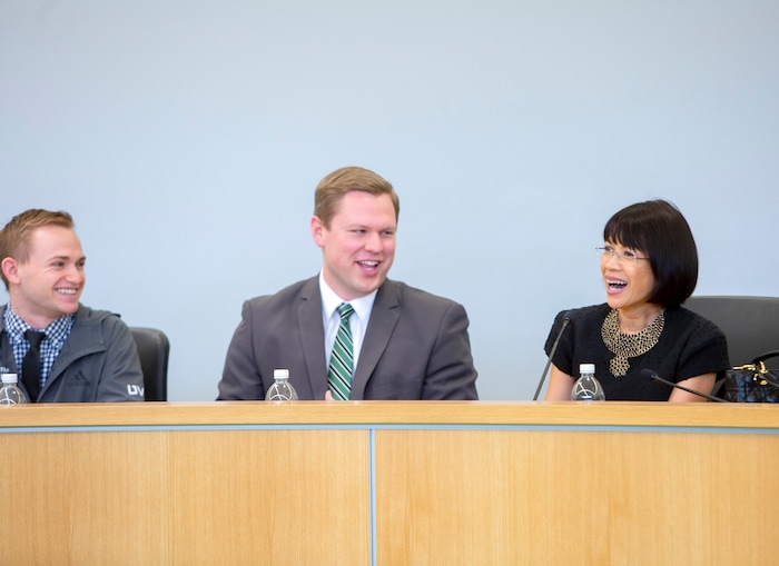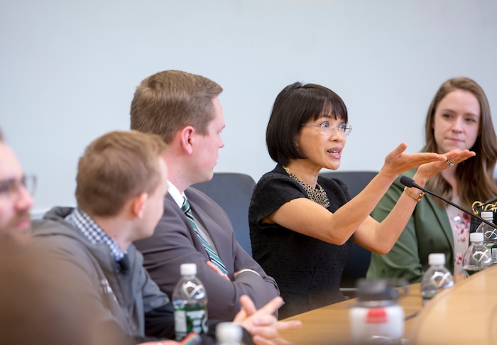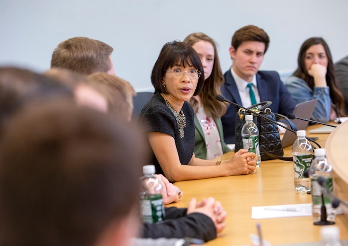 (Kim Raff | Special to Utah Valley University) Soon-to-be Utah Valley University President Astrid Tuminez talks with students during a UVU Student Association interview on Thursday, April 19, 2018. She will replace Matthew S. Holland, who is scheduled to leave the school in June to become an LDS Church mission president.