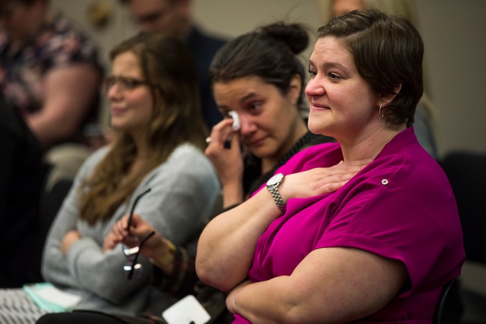 (August Miller | Utah Valley University) Tara Ivie, right Director of the Women's Success Center at UVU along with members of her staff, Whitney Sanchez, middle, and Emma Scruggs, left react to Astrid Tuminez being announced as the first women president of Utah Valley University at a press conference on the campus of Utah Valley University Friday April 20, 2018.