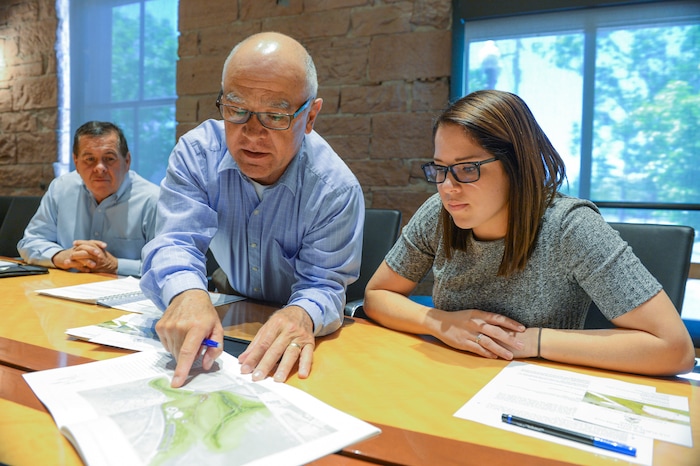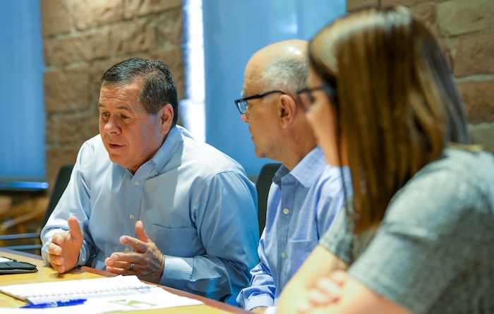 (Leah Hogsten | The Salt Lake Tribune) l-r Darren Parry, chairman of the Northwestern Band of the Shoshone Nation and architects David Garce and Baylee Lambourne with GSBS Architects, give details about the Boa Ogoi Cultural & Interpretive Center,Tuesday, May 8, 2018. The Northwestern Band of the Shoshone Nation's interpretive center, located near Franklin, ID will educate and enlighten the public about the history of the Northwestern Shoshone Band, their life ways, enduring spirit and the 1863 Bear River Massacre, the single largest mass killing of Native Americans in United States history.