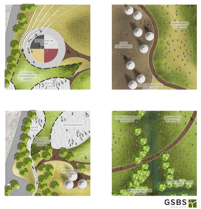 The Boa Ogoi Cultural & Interpretive Center's Mo-So-Di-Ka-Ne Plaza (top, left) represents a traditional medicine wheel. The Boa Ogoi Plaza (bottom, left) serves as the transitional area between the center and the Bear River Massacre Site Area, complete with demonstration tepees. The Newe Encampment and embankment areas (top and bottom, right) provides passive reflection of the 500 boulders that represent the lives lost and the Shoshone Nation's re-created winter encampment.