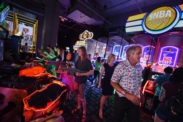 Eat a burger or a chicken-and-waffle sandwich, enjoy a Glow Kone cocktail with a neon green ice cube, play one of the 145 video or arcade games, or watch sports on one of about 36 big-screen TVs.