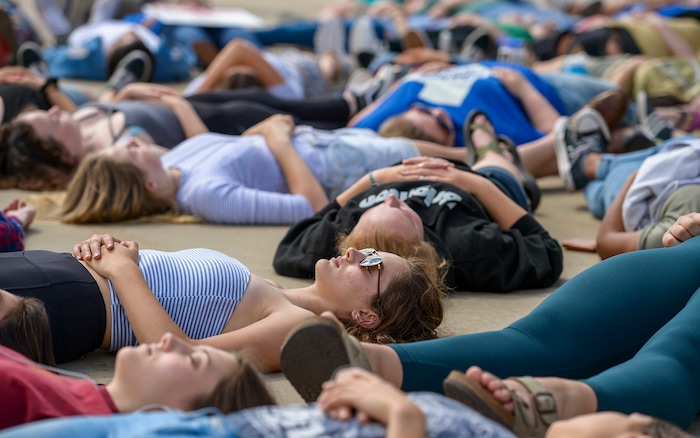 (Leah Hogsten | The Salt Lake Tribune) Brighton High School students Lydia Barrett and Josh Carlucci hold hands as they participate in the 22-minute die-in for the 22 school shootings already in 2018. Members of March For Our Lives SLC members and concerned citizens gather at the Utah Capitol, Friday, May 18, 2018, to demand gun reform and honor the 10 dead who were killed during Friday morning's shooting spree inside Santa Fe High School in southeast Texas.