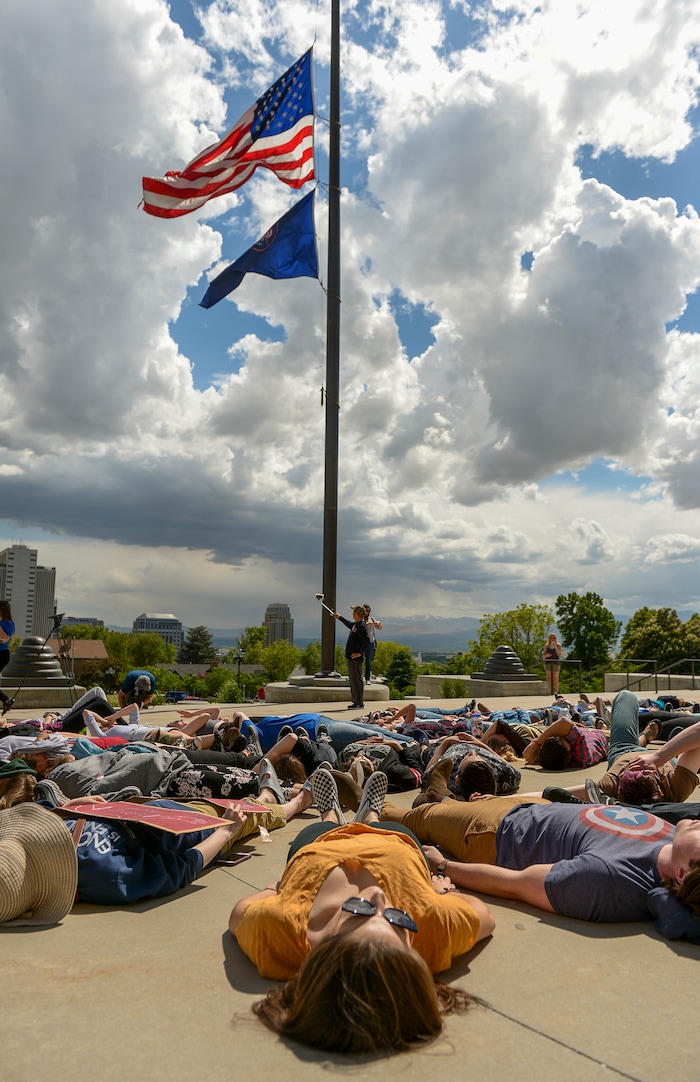 (Leah Hogsten | The Salt Lake Tribune) Over 70 members of March For Our Lives SLC, high school students and concerned citizens gather at the Utah Capitol, Friday, May 18, 2018, to demand gun reform and honor the 10 dead who were killed during Friday morning's shooting spree inside Santa Fe High School in southeast Texas.The participants staged a 22-minute die-in for the 22 school shootings already in 2018.