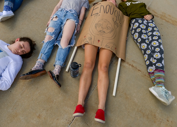 (Leah Hogsten | The Salt Lake Tribune) West High School freshman Zoey Doulson participates in the 22-minute die-in for the 22 school shootings already in 2018. Members of March For Our Lives SLC members and concerned citizens gather at the Utah Capitol, Friday, May 18, 2018, to demand gun reform and honor the 10 dead who were killed during Friday morning's shooting spree inside Santa Fe High School in southeast Texas.