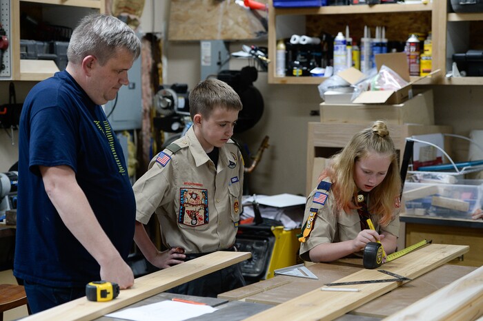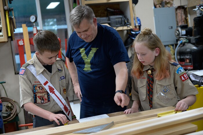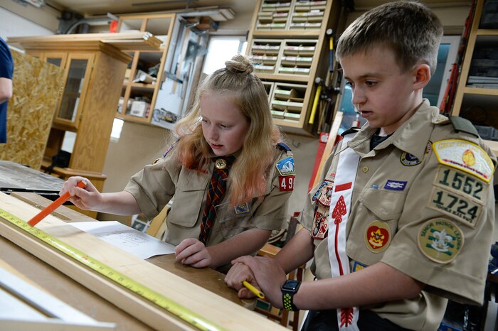 That’s how Miriam, along with five other girls, wound up spending a recent evening in the parking lot of St. Matthew’s Lutheran Church in Taylorsville, gathered around folding tables, constructing birdhouses for Kolbie’s Eagle Scout project. (Kolbie, 12, is quick to dictate a reporter’s story: “Put down ‘He’s the youngest person ever going for his Eagle Scout project.’” He’s not quite the youngest; a boy in California once made Eagle at 11.)