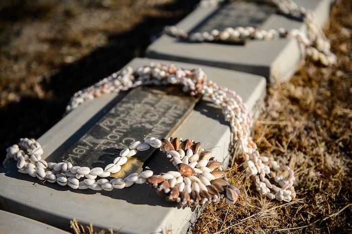 It took an hour and a thick pair of gloves to clear what had grown since she was here last year. And when she finished, Hoopiiaina lined seashells and plastic flower leis around the grave’s rectangular edge.