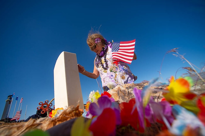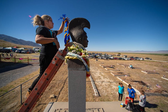(Trent Nelson | The Salt Lake Tribune) Descendants of the Hawaiians who settled the desert town of Iosepa took time during their Memorial Day gathering to clean the graves of their ancestors, Saturday May 26, 2018. Lina AhQuin puts a lei onto a historical monument.
