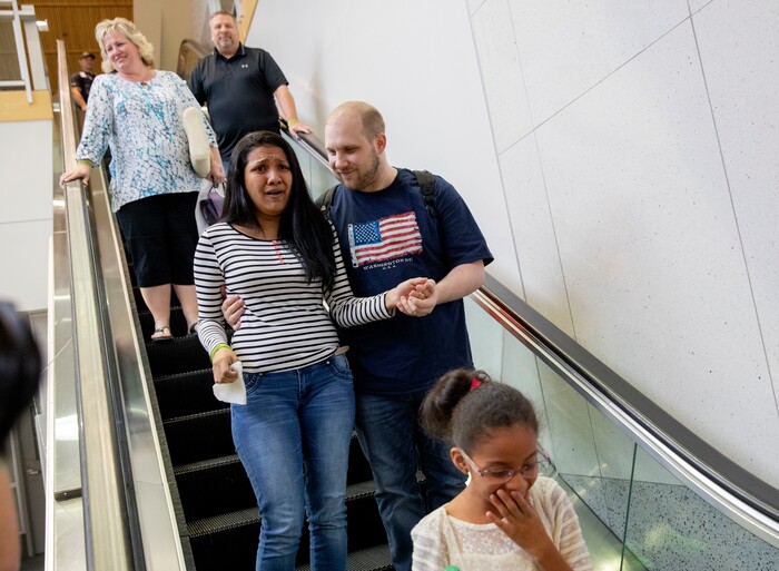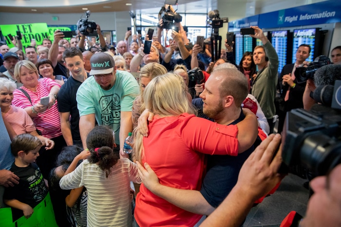 Thamara Caleno, left, Josh, right, and Marian Holt, bottom, react to a crowd of friends, family and supporters upon returning to Salt Lake City after receiving medical care and visiting President Donald Trump in Washington on Monday, May 28, 2018. Holt was freed this weekend after being held in a Venezuelan jail for nearly two years. (AP Photo/Kim Raff)