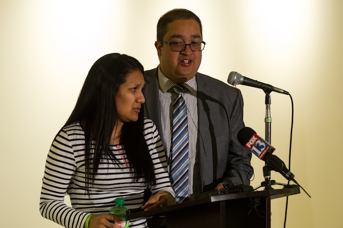 Thamy Holt, wife of Josh Holt speaks to the people through an interpreter in Riverton, Monday, May 28,2018