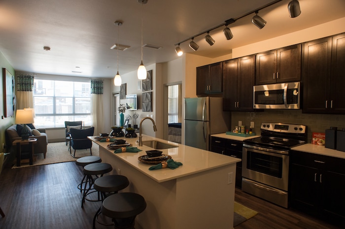 Today, the swanky westside apartments are leasing up, with over 80 percent of 277 units filled. Studios start at $1,100 a month; three-bedrooms go for $2,700 and above. Sixty percent of residents already settled in are from out of state, manager Steve Steck said. About a third work at the thriving downtown Salt Lake offices for investment banker Goldman Sachs, which also helped finance Alta Gateway.