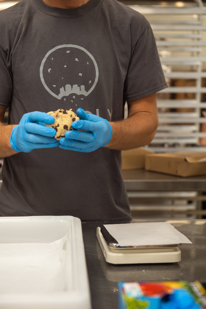 (Rachel Molenda | The Salt Lake Tribune) Brandon Plewe, Goodly Cookies co-owner, and Isabell Drake shape 6 ounces of gluten-free chocolate chip cookie dough before baking on Wednesday, June 6, 2018. The Salt Lake City cookie delivery service uses Amour Café's kitchen on 500 East and 1300 South in Salt Lake City.