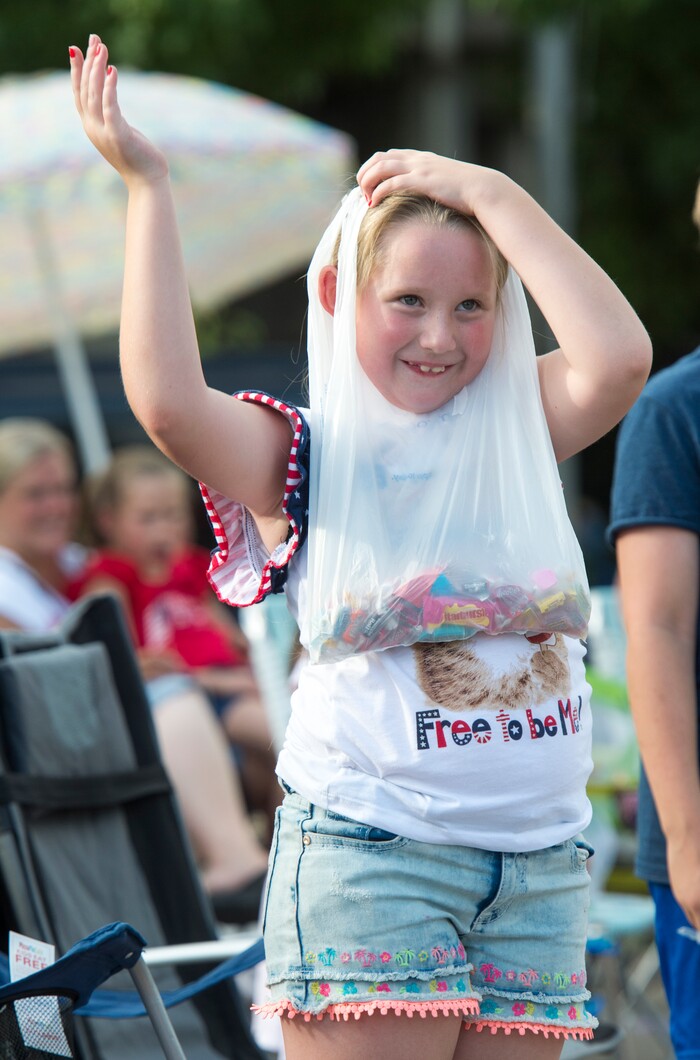 (Rick Egan | The Salt Lake Tribune) Emmie Morris holds her bag full of any as she waves at the Bountiful Handcart Days Parade at Maddie Hatter, Friday, July 20, 2018.