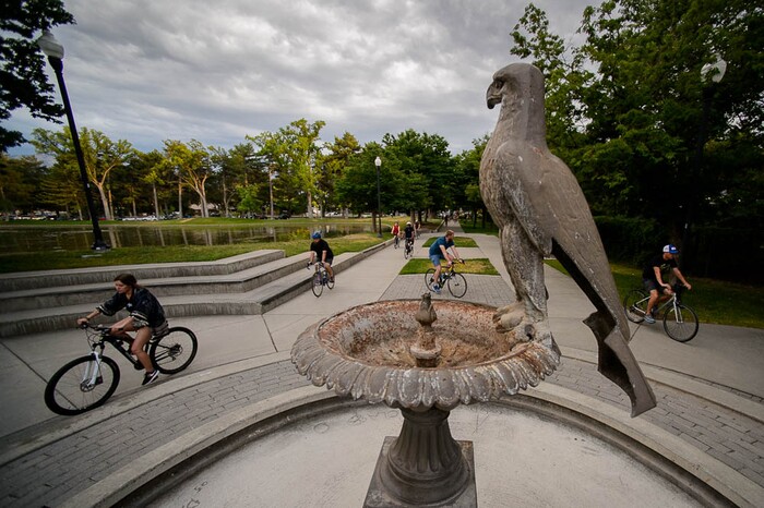On Saturday, cyclists finished the memorial ride in about 40 minutes. They then made their way up a grassy hill that overlooks Liberty Park’s pond from the north.