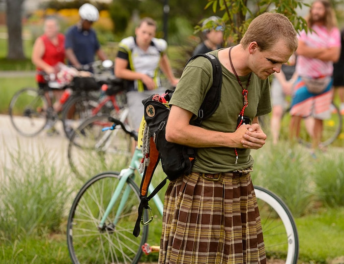 The cyclists started their slow procession at the Liberty Park flagpole on Saturday night to remember Cameron Hooyer, a fellow cyclist who was struck and killed by a train during a large group ride Thursday night. They rode three silent laps around the park in his honor.