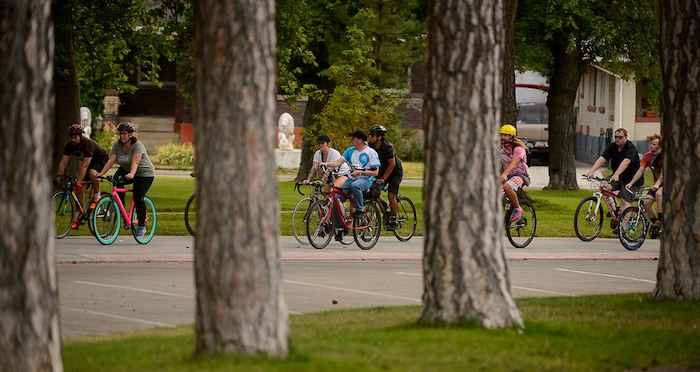 (Trent Nelson | The Salt Lake Tribune) Cyclists gather and ride around Salt Lake City's Liberty Park, Saturday July 21, 2018, in remembrance of Cameron Hooyer, a rider who was killed by a FrontRunner train during a 999 Ride on Thursday. Hooyer's parents Carla and Mark Hooyer.