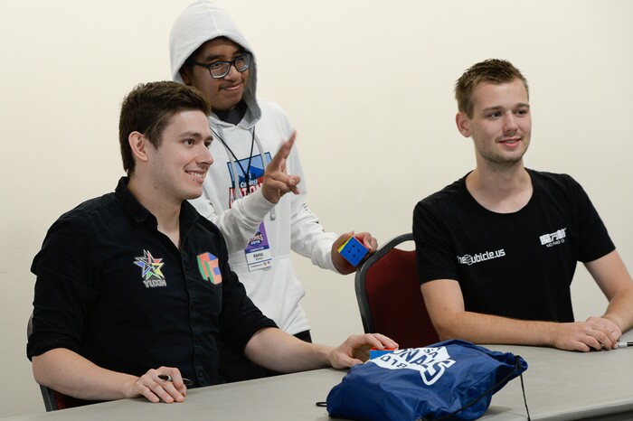 On Saturday, the second day of nationals, cubers sat together at tables in the center of the room, warming up their hands before competition and playing with unusually shaped puzzles. Backstage, “scramblers” got the cubes ready for the competitors, who sit onstage next to a timer that clocks their fastest solves.