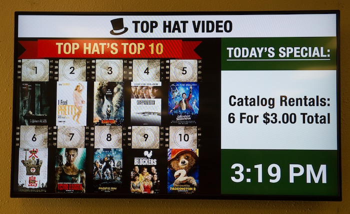 But stand-alone Top Hat was competing directly with a company that had more than 4,500 outlets in the United States. And against all odds, Top Hat is still standing. Today, it has the same number of stores as Blockbuster — which is down to just one, in Bend, Ore.