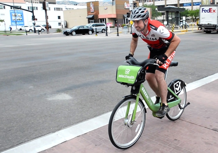 Leah Hogsten | The Salt Lake Tribune Salt Lake Tribune reporter Benjamin Wood rides a Green Bike from the Salt Lake City Library to The Salt Lake Tribune building, Thursday, August 2, 2018.