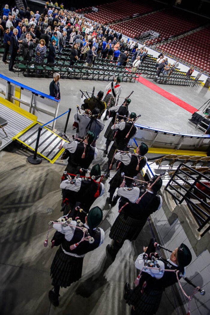 The Emerald Society Pipe and Drum band at funeral services for Jill Robinson, a West Valley City code-enforcement officer killed on the job last week. The service took place at the Maverik Center in West Valley City on Friday Aug. 17, 2018.