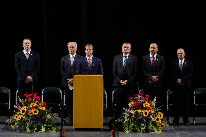 Bishop Steve Tingey conducts funeral services for Jill Robinson, a West Valley City code-enforcement officer killed on the job last week. The service took place at the Maverik Center in West Valley City on Friday Aug. 17, 2018.