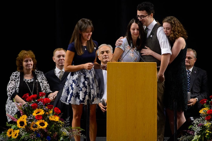 Jill Robinson's children, Katie Merrill, Jessica Knorr, Riley Merrill, and Halie Merrill speak at funeral services for Jill, a West Valley City code-enforcement officer killed on the job last week. The service took place at the Maverik Center in West Valley City on Friday Aug. 17, 2018.