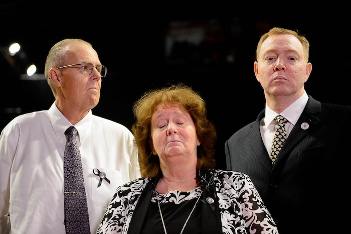 Julie Egelund reads a statement about her sister Jill Robinson, a West Valley City code-enforcement officer killed on the job last week prior to funeral services at the Maverik Center in West Valley City on Friday Aug. 17, 2018. At left is Julie's husband Kent Egelund, at right her brother Jaren Robinson.