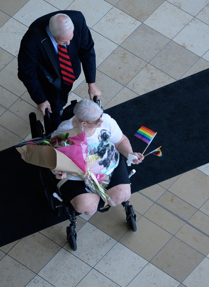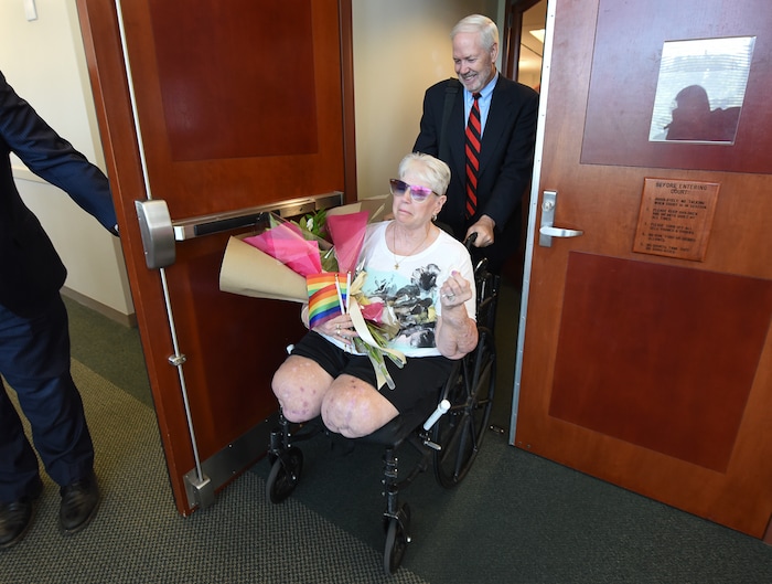 (Francisco Kjolseth | The Salt Lake Tribune) Escorted by attorney Roger Hoole, at the Matheson Courthouse, Bonnie Foerster, 74, of South Salt Lake finally gets her wish of marrying her common-law partner of 50 years, Beverly Grossaint, even though she died on May 27 of this year. Foerster, who is legally blind and a double amputee shed tears of joy on Tuesday, Aug. 21, 2018, exclaiming "I can finally start healing," after a judge provided the legal recognition and allowed her to be legally married.