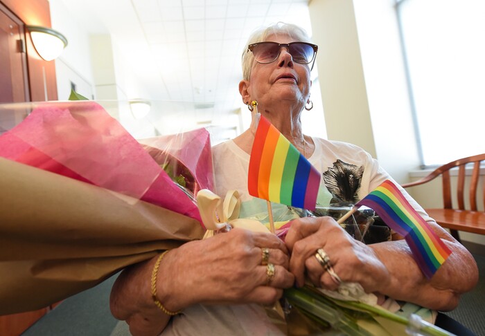 (Francisco Kjolseth | The Salt Lake Tribune) Bonnie Foerster, 74, of South Salt Lake, finally gets her wish of marrying her partner of 50 years, Beverly Grossaint, even though Grossaint died on May 27, 2018. Foerster, who is legally blind and a double amputee, shed tears of joy on Tuesday, Aug. 21, 2018, exclaiming, "I can finally start healing," after a judge provided the legal recognition and allowed her to be legally married.