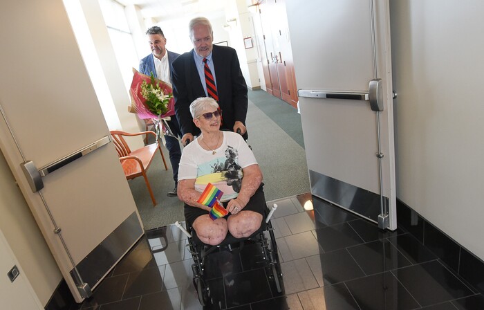 (Francisco Kjolseth | The Salt Lake Tribune) Bonnie Foerster, 74, of South Salt Lake finally gets her wish of marrying her common-law partner of 50 years, Beverly Grossaint, even though she died on May 27. Foerster, pushed by her attorney Roger Hoole is joined by Utah Pride Center Executive Director Rob Moolman as she beams with excitement before her court appearance where a judge provided the legal recognition and allowed her to be legally married on Tuesday, Aug. 21, 2108, at the Matheson Courthouse in Salt Lake City.