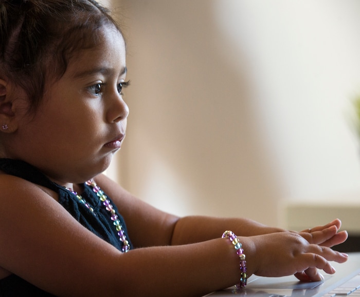 In the Andino-Santana household, the digital preschool has become a tradition. The couple’s older daughters, 9 and 11, enrolled soon after the state began to fund it, and have been given accelerated coursework in elementary school. Their youngest child, 3-year-old Kiara, began playing along with Adrian’s account last year when she was 2. On Friday, she quietly clicked through screen after screen of clothing vocabulary, choosing pants and shirts for a cartoon cat. Her mother said she recently was tested at her brick-and-mortar preschool, where teachers identified her reading level as “advanced.”
